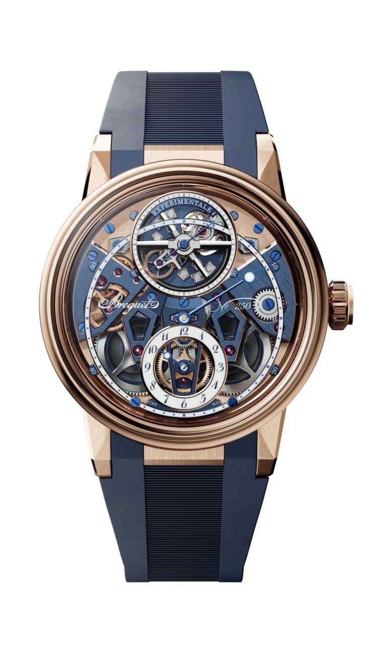 Il movimento che anima l’Expérimentale 1 è il calibro manuale 7250, interamente sviluppato per questo progetto. Realizzato in oro Breguet 18 carati, è composto da 266 elementi e 37 rubini. La riserva di carica raggiunge le 72 ore grazie a un sistema a doppio bariletto montato in serie, con quattro molle blu, una novità cromatica per la maison.