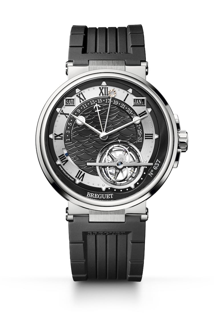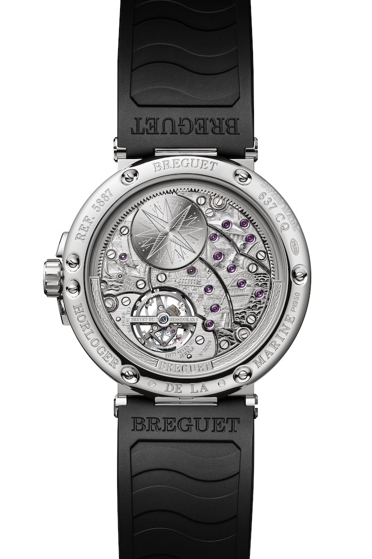 Il Marine Tourbillon Équation Marchante 5887 è disponibile con cinturino in caucciù nero, completato da una fibbia déployante tripla in platino. Il prezzo è di 297.000 euro.