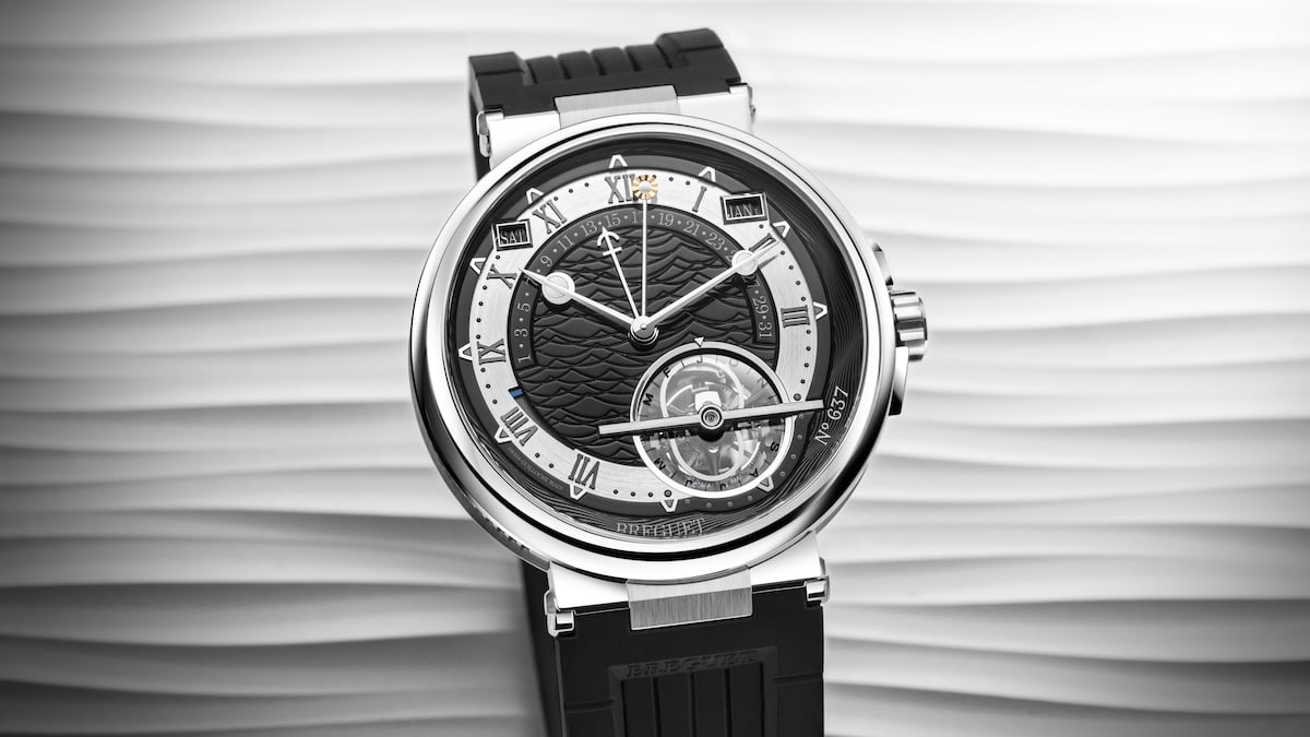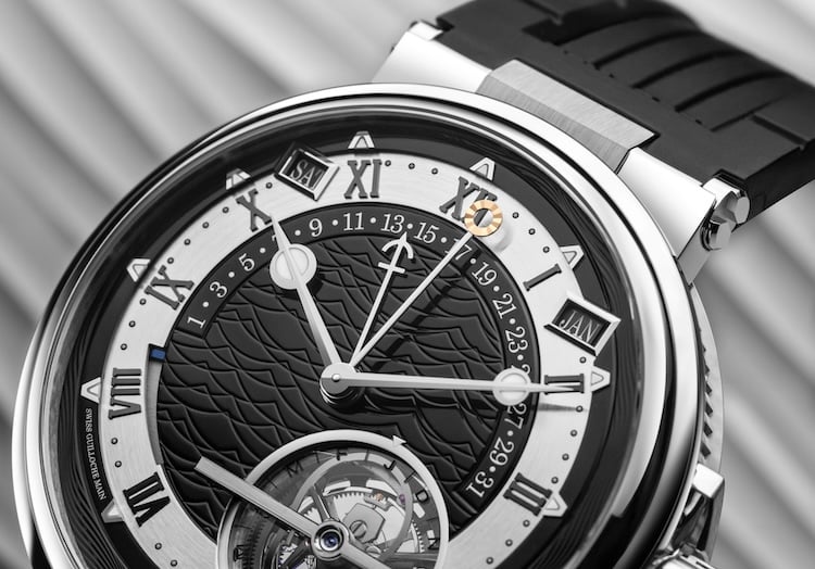 La cassa in platino 950, con una carrure scanalata, esprime una robustezza sofisticata. Il quadrante nero, lavorato a mano, è decorato con numeri romani in oro annerito e dettagli nautici come indici piramidali luminescenti e lancette a tema marittimo. Ogni elemento è un tributo al mare e alla tradizione navale di Breguet.