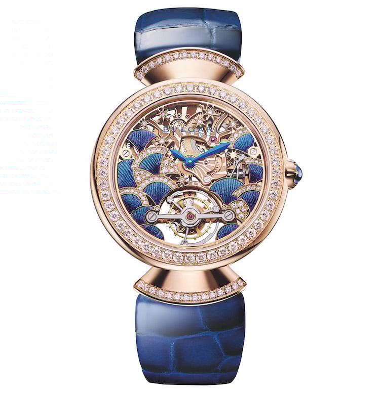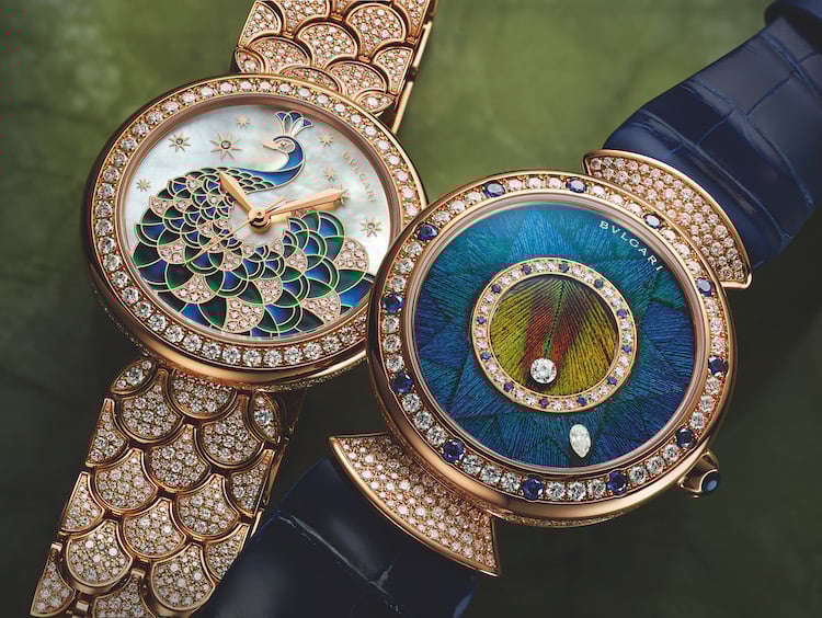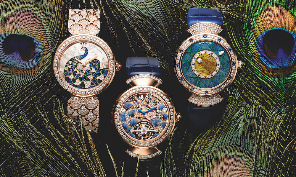 Divas’ Dream Peacock Diamonds presenta invece un motivo a pavone inserito in uno sfondo in madreperla. L’uccello è dipinto a mano con accurate partizioni che evocano i mosaici romani e le loro tonalità blu e verdi, ed è realizzato utilizzando una tecnica orafa chiamata champlevé che risale al Medioevo: un’incisione del materiale che permette di applicare la pittura in miniatura, lo smalto e l’intarsio. Le tonalità del quadrante sono coronate da diamanti e valorizzate da un bracciale flessibile con il caratteristico motivo a ventaglio di Divas’ Dream, interamente tempestato di diamanti. Ad alimentare l’orologio, il movimento meccanico a carica automatica Calibro BVL 191, con autonomia di 42 ore. Il Divas’ Dream Peacock Tourbillon Lumière, infine, è il più raro dei tre segnatempo Bulgari, realizzato in soli 10 esemplari. La cassa è in oro rosa di 37 mm di diametro, con la lunetta e le anse incastonate con diamanti taglio brillante, mentre il quadrante scheletrato è decorato con un intarsio di piuma naturale di pavone e con diamanti montati a neve. Ad attirare lo sguardo verso il basso è il movimento tourbillon scheletrato a carica manuale calibro BVL 208, con riserva di carica 64 ore. Ad accompagnare il segnatempo, un cinturino in alligatore blu con fibbia pieghevole in oro rosa 18 kt incastonata con diamanti taglio brillante.