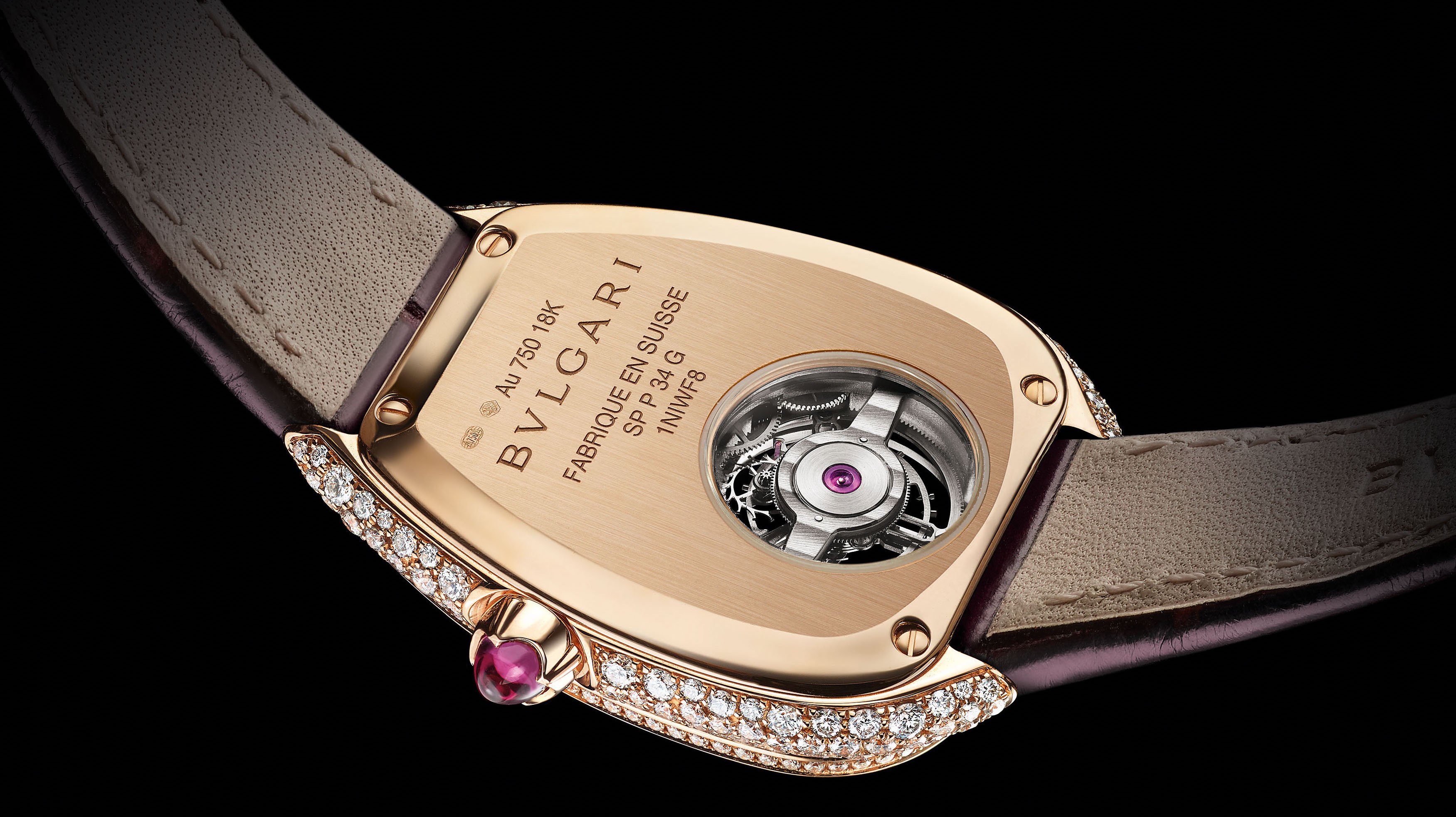 Questo piccolo movimento di alta orologeria è rodiato, decorato a mano con finiture Côtes de Genève, perlage e anglage, e presenta un ponte in zaffiro. Bulgari ha scelto per il Serpenti Sedutorri Tourbillon un retro cassa trasparente proprio al livello del movimento a carica manuale per evidenziarne la costruzione e permettere a chi lo indossa di ammirare ogni dettaglio di questo meccanismo che, grazie ai suoi 22 x 18 mm e allo spessore di soli 3,65 mm, rappresentai  movimento tourbillon più piccolo attualmente sul mercato.
