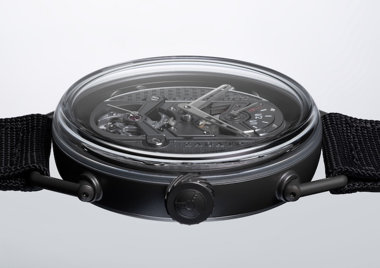 La cassa da 42 millimetri di diametro e 11,15 millimetri di spessore è realizzata in titanio ceramicizzato sabbiato color antracite, lo stesso materiale utilizzato per platina e ponti del movimento. Questo trattamento, ottenuto tramite ossidazione elettro-plasma, porta la durezza del titanio a circa 1000 Vickers, con una resistenza a graffi e urti paragonabile alla ceramica, mantenendo però una massa estremamente contenuta.