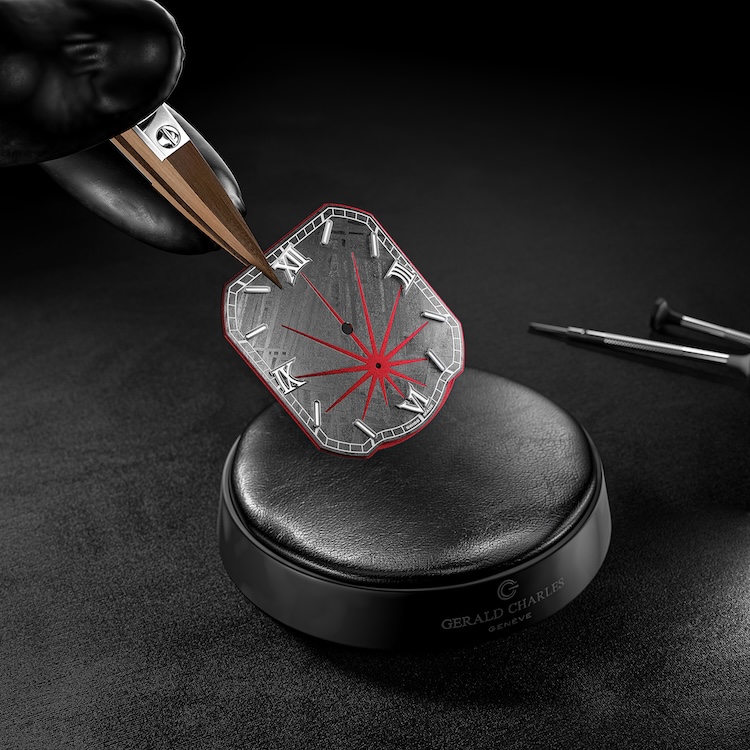 Durante l’intero processo, ogni frammento viene mantenuto immerso in un liquido protettivo per evitare l’ossidazione immediata. A questo si aggiunge la fase di incisione delle aperture radiali e della zona dei piccoli secondi, che richiede una precisione elevatissima per non compromettere l’integrità del materiale. Il risultato è un quadrante a doppio livello, in cui il meteorite non è un semplice rivestimento, ma una superficie strutturale che dialoga con la base sottostante.