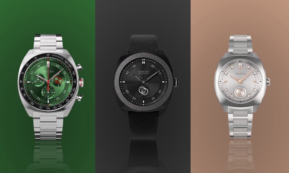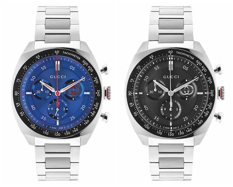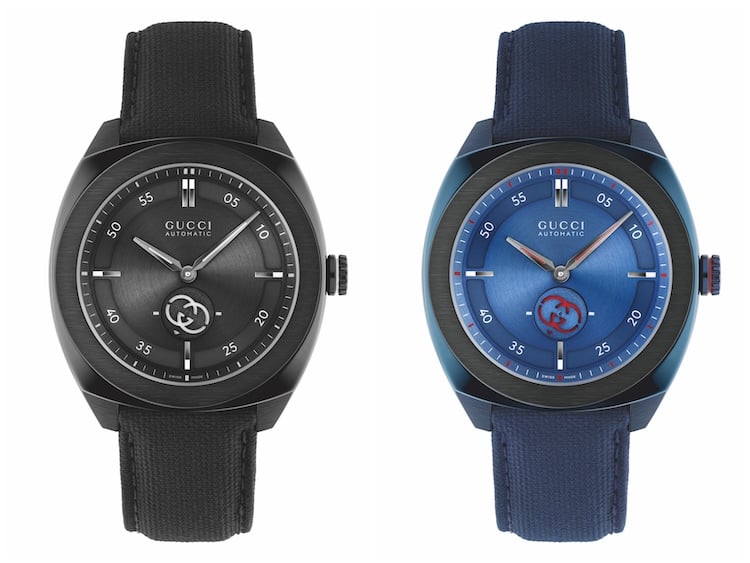 La gamma automatica da 41 mm presenta invece due varianti in PVD spazzolato blu o nero, abbinate a cinturini sportivi in caucciù. L’iconico motivo GG a ore 6, di colore abbinato all’anello intorno alla corona, funge da lancetta dei secondi e incarna il design raffinato della collezione. Sia i modelli automatici che quelli cronografo si distinguono per il loro fascino sportivo e sofisticato.