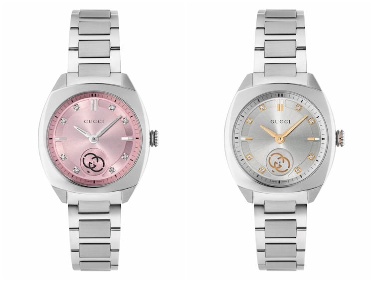 Le due versioni da 29 mm, impreziosite da diamanti, irradiano femminilità ed eleganza in ogni dettaglio. Questi modelli presentano quadranti argentati spazzolati con tocchi di rosa o un quadrante rosa spazzolato, con otto indici di diamanti e il motivo GG nel contatore dei piccoli secondi. Il bracciale in acciaio e la caratteristica forma a cuscino di Gucci aggiungono profondità e valorizzano il design raffinato, catturando l’essenza dell’estetica moderna della maison.