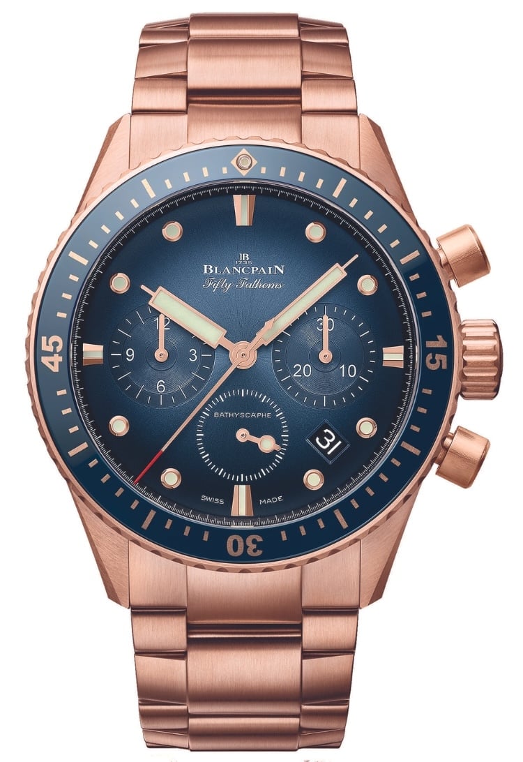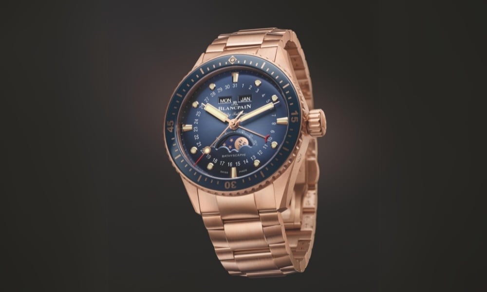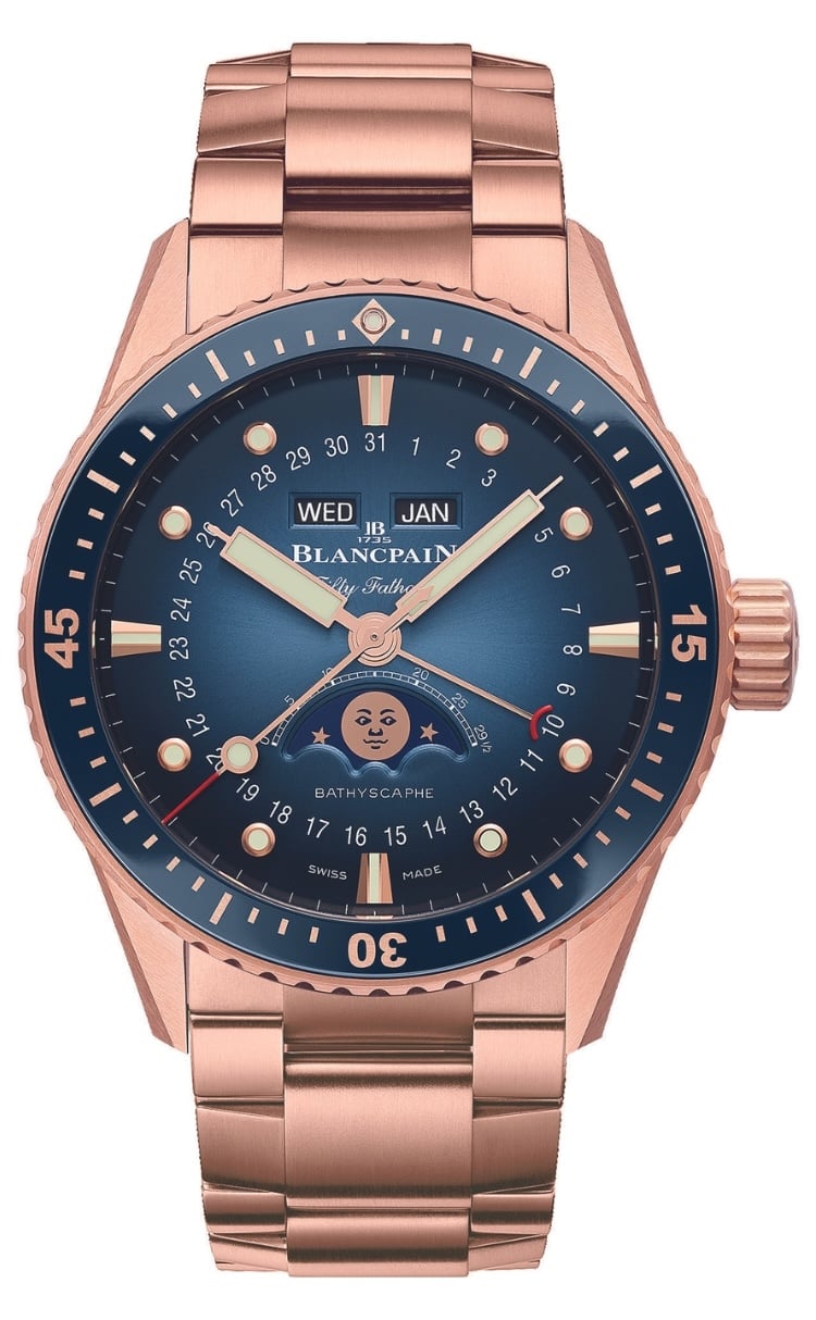 Blancpain presenta i nuovi modelli Bathyscaphe Quantième Complet e Chronographe Flyback in oro rosso.
