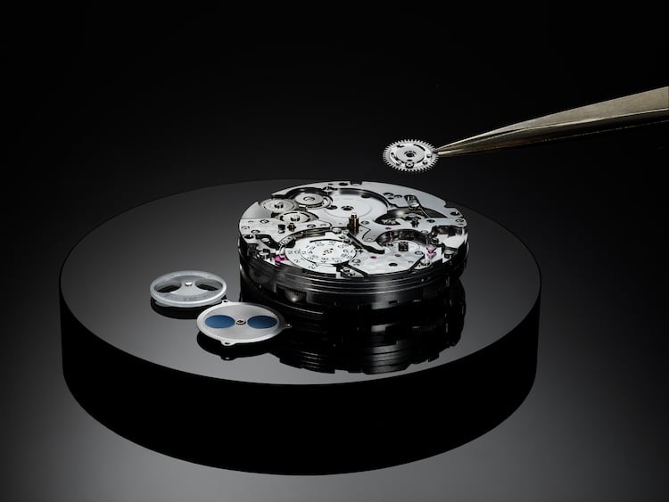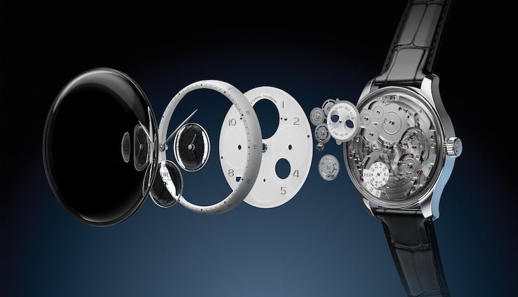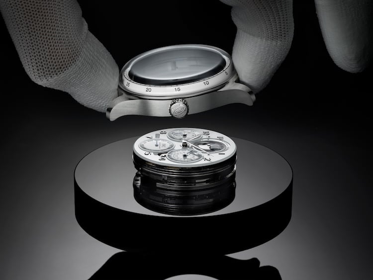 Sul quadrante, la visualizzazione delle fasi lunari è affidata a due dischi sovrapposti: quello inferiore in titanio decorato con un motivo guilloché, quello superiore in vetro.