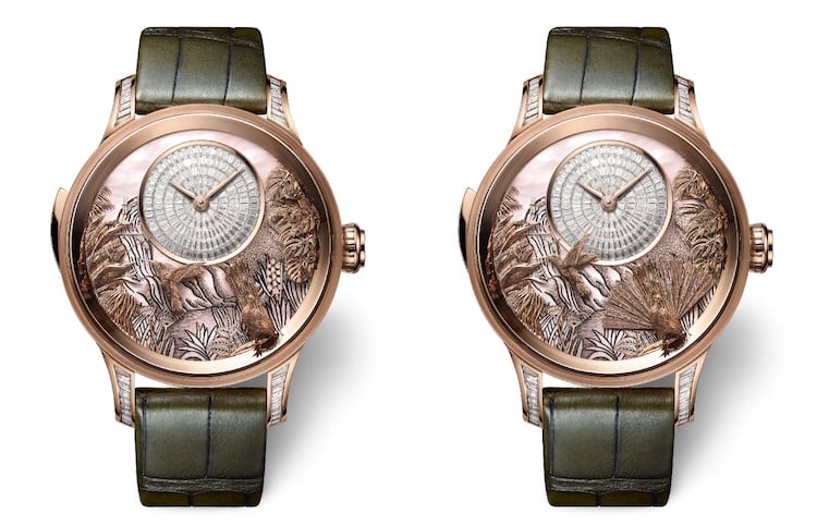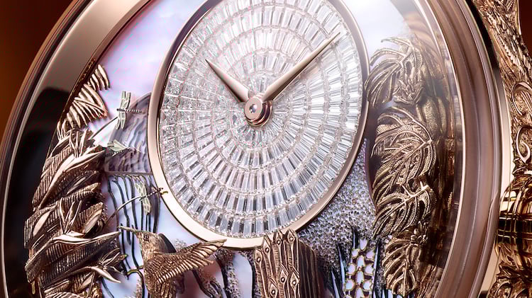 La passione per la natura, da tempo marchio distintivo di Jaquet Droz, si unisce alla creatività che da sempre caratterizza i prodotti della maison per dare vita a Tropical Bird Repeater, un orologio realizzato in madreperla dai riflessi rosa caratterizzato dal quadrante delle ore tempestato di diamanti taglio baguette. A catturare l’occhio dello spettatore è la cornice tropicale realizzata interamente a mano con al centro un pavone, un tucano, una libellula e un colibrì. Quest’ultimo è il protagonista di un’animazione speciale: le ali battono infatti 40 volte al secondo, un inedito nella storia dell’orologeria.