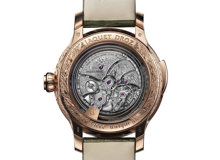 A destra dell’animale, il pavone mette in mostra le piume e poi chiude la coda, mentre a ore 3 il tucano si affaccia aprendo il becco tra le foglie di Monstera Deliciosa che si schiudono. Ad arricchire l’immagine, il volo di tre libellule a ore 9, le cui ali trattate in SuperLuminova brillano al buio. Sette animazioni in tutto, di durata superiore ai 12 secondi e che creano fino a quattro diversi scenari, con il colibrì e le foglie applicati sul quadrante per conferire volume e dare la sensazione di uscire dall’orologio. La vegetazione che circonda il cuore del segnatempo è invece attraversata da una cascata nella parte superiore e da un fiume in quella inferiore.Il centro del quadrante del nuovo Tropical Bird Repeater è impreziosito da 180 diamanti taglio baguette (per un totale di 1,8 carati) con incastonatura invisibile, che illuminano la composizione. La lancette di ore e minuti sono in oro rosso, lo stesso materiale della cassa da 47 mm. È inoltre la prima volta che gli artigiani Jaquet Droz incastonano le anse con 36 diamanti baguette (2,76 carati). L’orologio si fregia della ripetizione minuti, una complicazione che permette di far suonare le ore, i quarti e i minuti a richiesta grazie alla vibrazione dei timbri cattedrale, attivati dai martelli posti all’interno della cassa. Il movimento Jaquet Droz RMA89 è dotato di un regolatore volante. Fra le innovazioni, nuove molle dei rastrelli, una pausa prolungata fra i quarti e i minuti e una suoneria dei quarti in terza maggiore. La riserva di carica è stata portata a 50 ore.