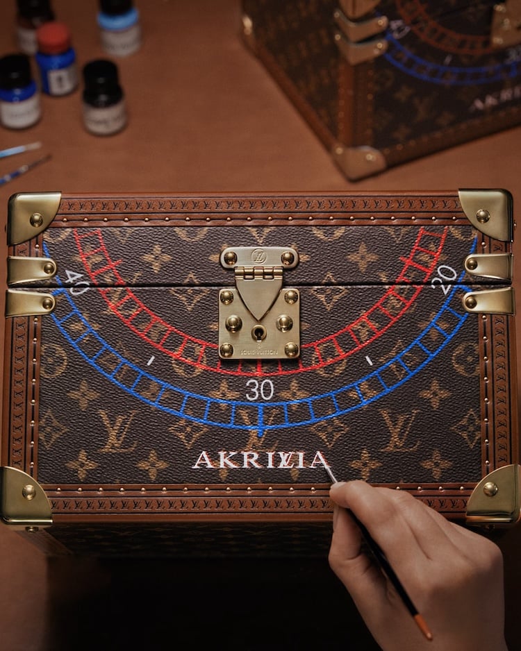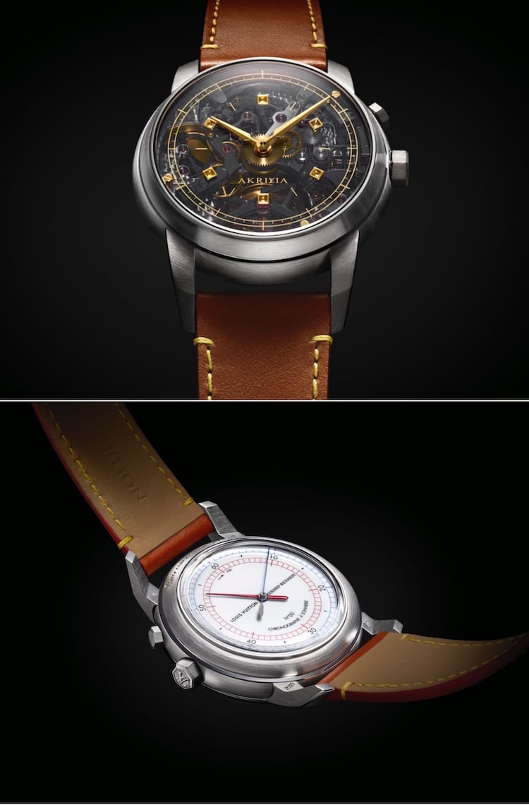 All’interno, il segnatempo creato da Louis Vuitton e Atelier Akrivia custodisce il calibro Rexhep Rexhepi, con decorazioni realizzate a mano e leve del cronografo dalla forma aggraziata.