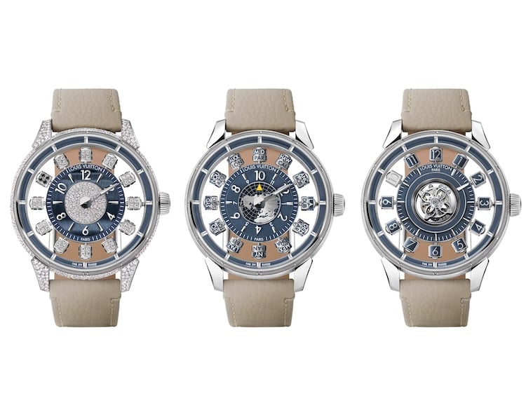 I modelli sono disponibili in due dimensioni, 39,5 mm e 42,5 mm, entrambi in oro bianco 18 carati. La finitura della cassa combina superfici satinate e lucide, con dettagli a rilievo come l’incisione “Louis Vuitton” sulla lunetta, incastonata in un canale sabbiato. La cura del dettaglio si estende alle anse, composte da due elementi perfettamente integrati grazie a una lavorazione che raggiunge la precisione di 0,1 mm.