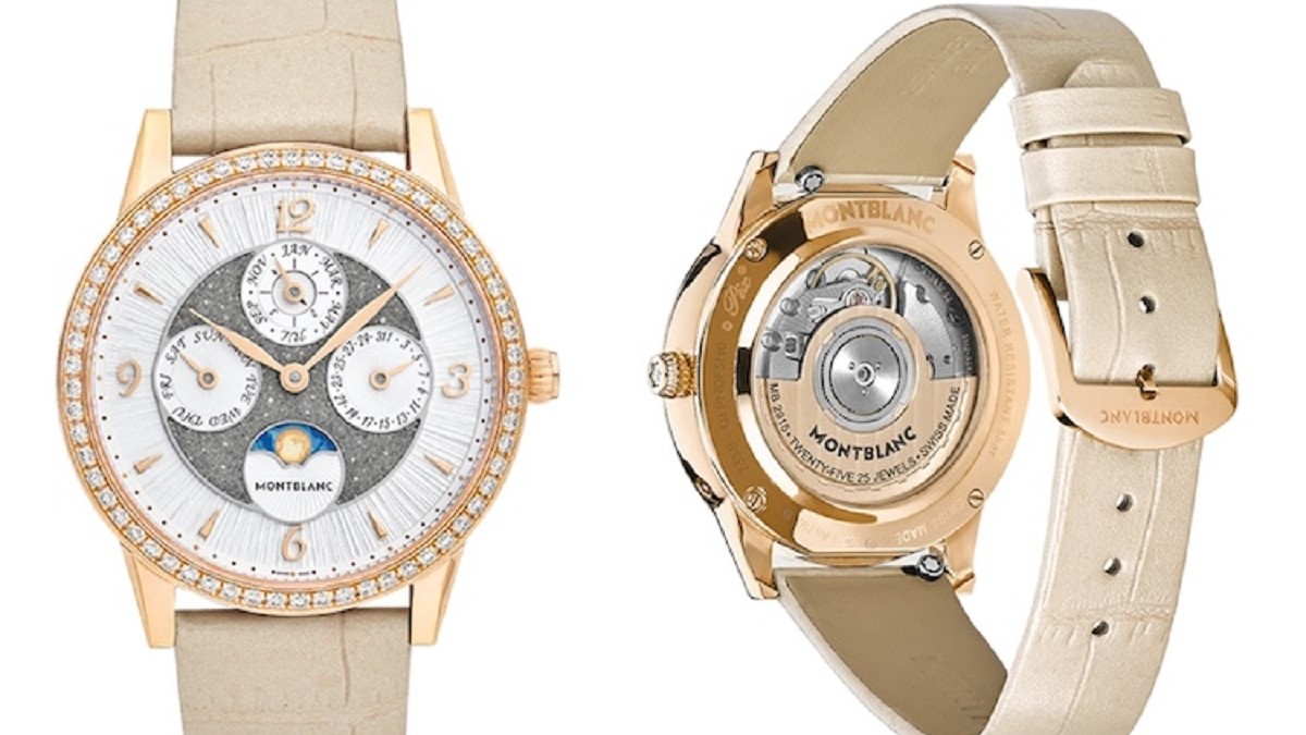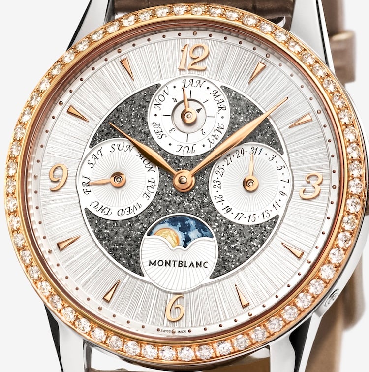 Montblanc firma un calendario perpetuo da 36 mm che unisce micro-diamanti, acquerello e scia di stelle in un quadrante compatto e leggibile.
