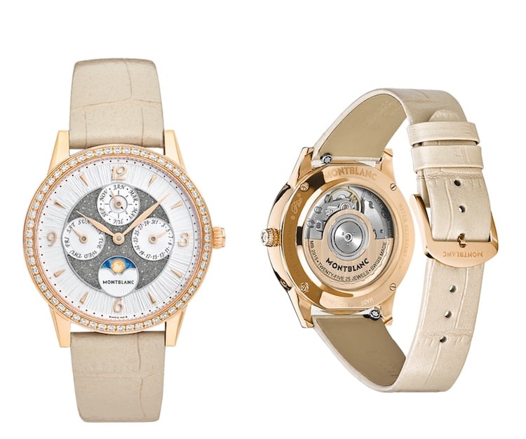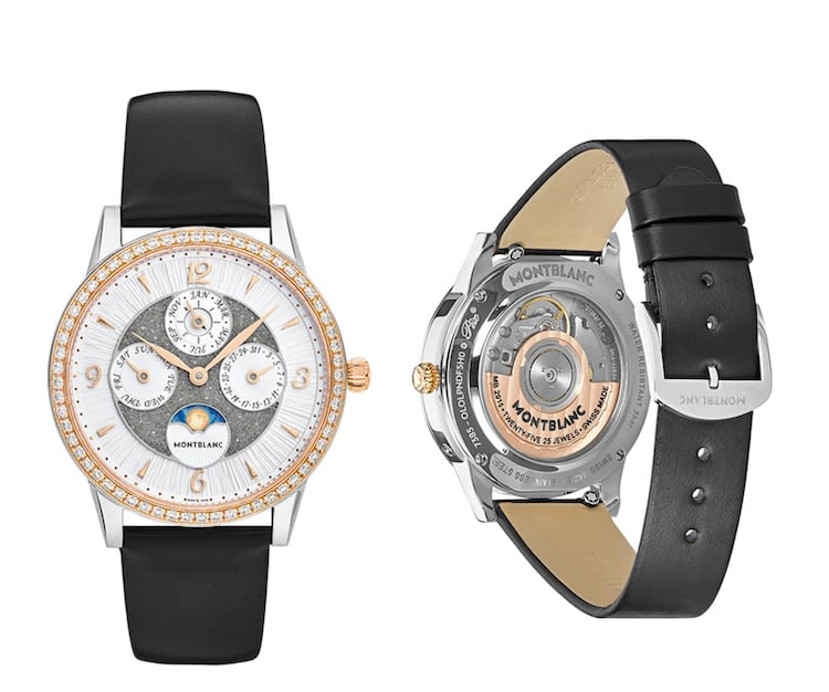 Anche la lunetta, in oro rosa 750/1000, contribuisce allo scintillio complessivo, grazie a 60 diamanti taglio brillante (circa 0,9 carati) che funzionano anche da minuteria. Non è un caso: come ricorda Montblanc, ogni dettaglio decorativo qui serve prima di tutto la funzione orologiera.