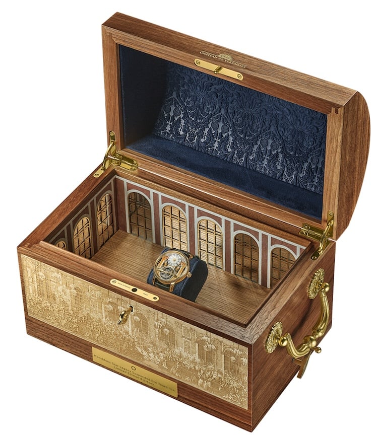 Ogni Montblanc Star Legacy Suspended Exo Tourbillon Château de Versailles è custodito in un cofanetto realizzato da Elie Bleu e Reuge, che riproduce la musica composta da Jean-Philippe Rameau per il celebre ballo. Quando il meccanismo si attiva, il segnatempo ruota sul suo parquet in miniatura, come se prendesse parte al ricevimento del 1745. È un’esperienza sensoriale totale, dove il suono, la luce e la meccanica si fondono in un’unica narrazione del tempo.