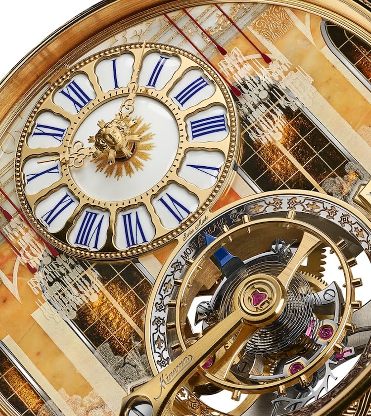 La cassa in oro giallo 750/1000, dal diametro di 44,8 mm e spessore di 15,52 mm, custodisce un quadrante che racconta la scena del ballo attraverso materiali rari: marmo Sarrancolin, opale Cacholong e intarsi in rovere che ricreano il parquet della reggia. Sullo zaffiro, gli artigiani Montblanc hanno inciso con laser e smalto champlevé i lampadari e gli ospiti in maschera, restituendo la luce vibrante della sala e il mistero delle sagome travestite. Ogni esemplare è unico, grazie alle naturali variazioni dei materiali e alla lavorazione interamente manuale.