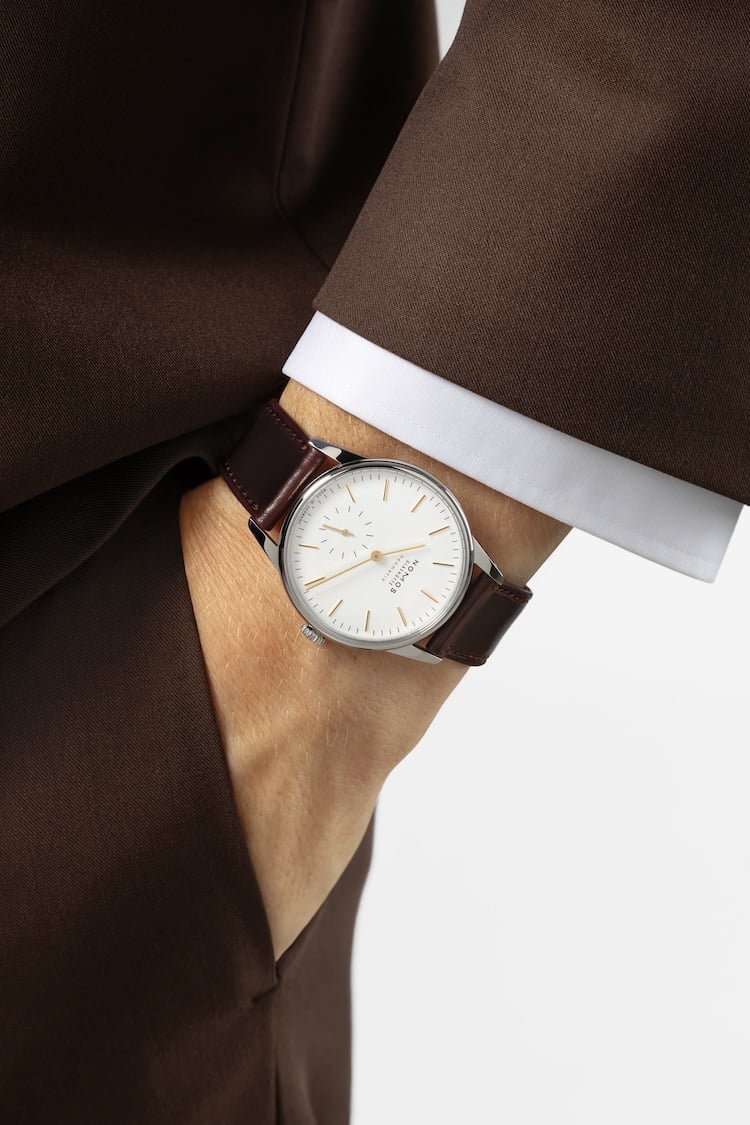 Il cinturino in pelle marrone Horween Genuine Shell Cordovan completa l’estetica classica del Tangente, offrendo durata e comfort.