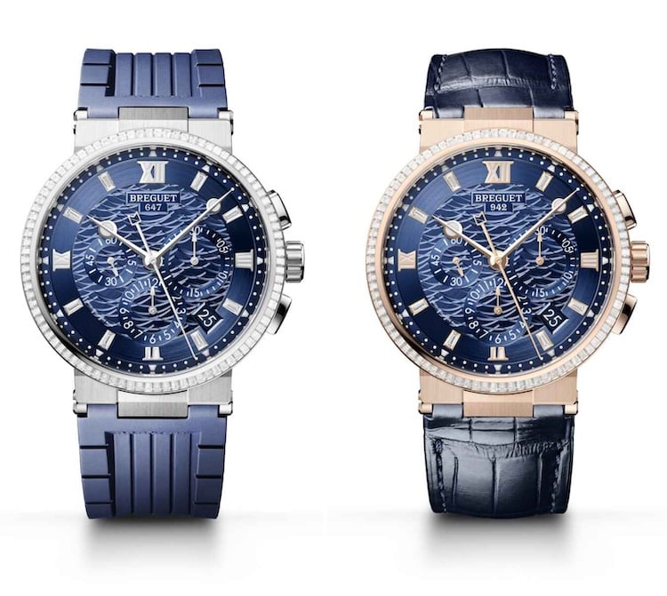 Oltre a questi due orologi, Breguet presenta anche Marine Chronographe 5529 in oro bianco o rosa, nuova declinazione dal fascino sportivo presentata con quadrante blu intenso ornato da motivi a onde, con lavorazione guilloché realizzata a mano. Per esaltare l’aspetto luminoso del segnatempo, le lancette sono rivestite in materiale luminescente. All’interno, il segnatempo ospita il calibro meccanico a carica automatica 582 QA, con riserva di carica di 48 ore. Il movimento può essere ammirato attraverso il fondello in vetro zaffiro.