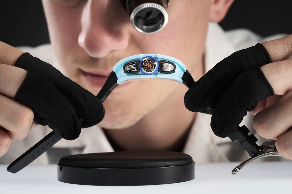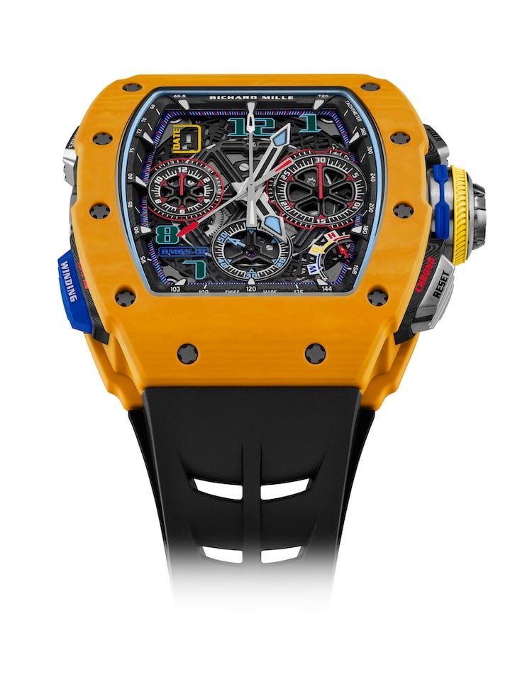 Con la sua ruota a 6 colonne, il calibro RMAC4 orchestra magistralmente la misurazione del tempo. Questo movimento automatico è dotato di un bilanciere con inerzia variabile ad alta frequenza, con 36.000 alternanze all’ora. Un pulsante situato a ore 8 permette di ricaricare rapidamente la molla del bariletto, a rotazione rapida. Il motore di questo cronografo beneficia quindi di una autonomia di 60 ore. Il selettore di funzione sulla corona consente a chi lo indossa di passare rapidamente dalla modalità di carica tradizionale (W), all’impostazione della data semi-istantanea (D) e infine alla regolazione di ore e minuti (H). Il cronografo automatico sdoppiante RM 65-01 in Quartz TPT giallo scuro e Quartz TPT blu pastello è pensato per un’estate da vivere tutta d’un fiato, ricca di sensazioni ed esperienze: per conoscere prezzo e disponibilità dei modelli, in edizione limitata a 12o esemplari, è necessario contattare la maison.