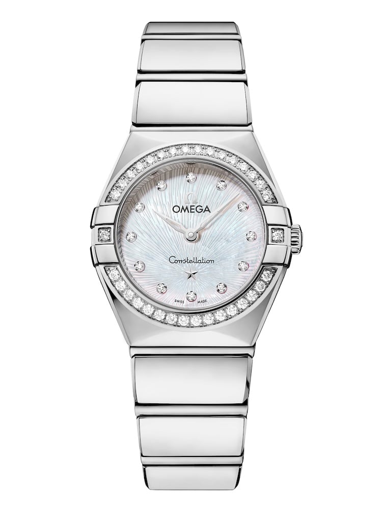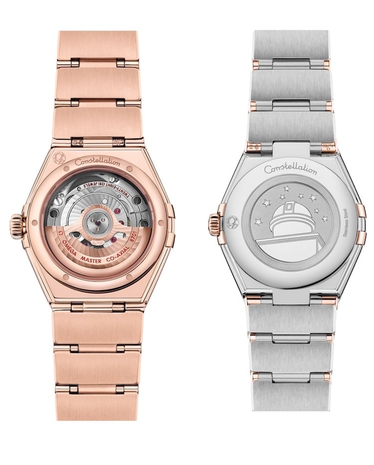 Per le versioni da 28 mm e 25 mm, la precisione è garantita dai movimenti al quarzo, identificabili dal medaglione Constellation con l’effigie dell’Osservatorio impresso sul fondello in metallo.
