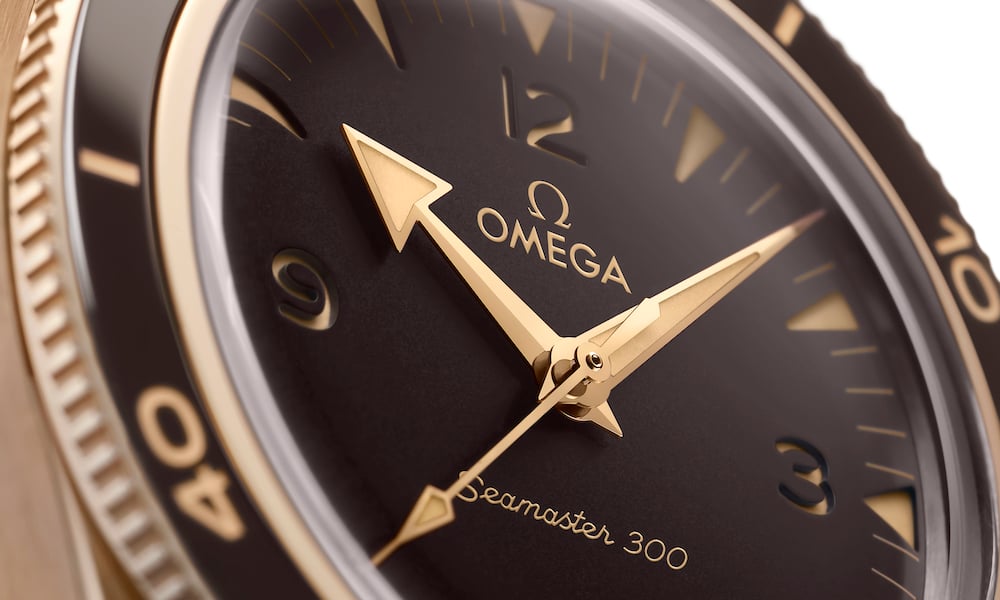 Fiore all’occhiello della collezione, un modello da 41 mm realizzato con l’esclusivo Bronze Gold di Omega: si tratta del primo segnatempo creato con questo materiale in attesa di brevetto. Specificamente sviluppato per essere indossato senza subite sgradevoli alterazioni cromatiche a contatto diretto con la pelle, il Bronze Gold utilizzato per la cassa e la fibbia, è una nuova lega arricchita con elementi nobili come l’oro al 37,5%, marchiato 9K, il palladio e l’argento, per creare un colore unico rosa tenue ed offrire grande resistenza alla corrosione, senza l’ossidazione del verderame. Per il quadrante, che non viene a contatto con la pelle, è stato invece scelta la lega comune del bronzo (CuSn8) con una patina creata dopo uno speciale processo di invecchiamento. A completare l’orologio Bronze Gold della collezione Seamaster è l’anello della lunetta in ceramica marrone, con scala di immersione in Super-LumiNova vintage. Il modello è dotato di garanzia completa di 5 anni ed è alimentato dal calibro OMEGA Co-Axial Master Chronometer 8912.