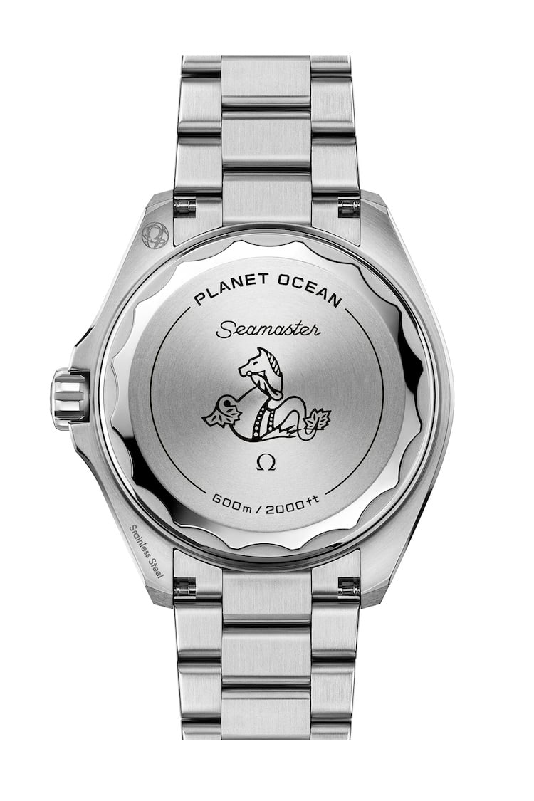 Il fondello, in titanio grado 5, è avvitato e inciso con onde, ippocampo e riferimenti tecnici. Il corpo della cassa incorpora inoltre un anello interno in titanio, derivato dalle ricerche dell’Ultra Deep, funzionale alla resistenza fino a 600 metri.