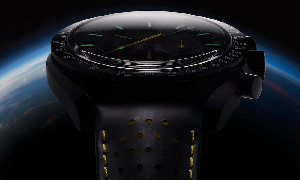 Per la creazione della cassa da 44,25 mm, del fondello e della lunetta lucida Omega si è servita di pezzi distinti di ceramica nera, riempiendo la scala tachimetrica di smalto “Grand Feu” bianco brillante. La lancetta cronografica centrale dei secondi è laccata gialla, scelta cromatica che si estende anche al cinturino traforato, realizzato in caucciù nero con interno giallo.