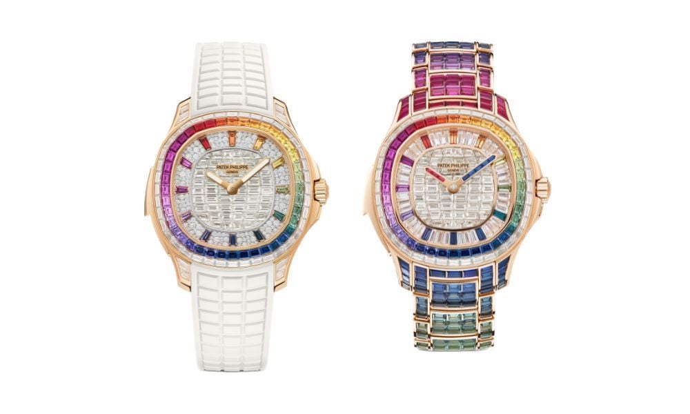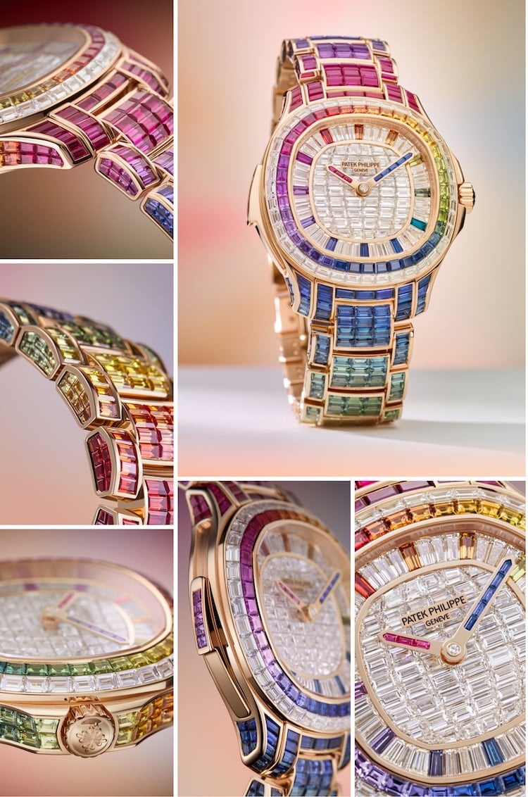 La Ref. 5260/1455R-001 esibisce invece un pavé di 130 diamanti taglio baguette sul quadrante e sulla fila esterna della lunetta e di 779 zaffiri taglio baguette multicolori che formano un arcobaleno sulla fila interna della lunetta, sui fianchi della cassa, sul cursore della ripetizione minuti e sul bracciale in oro rosa. Anche in questo caso, la leggibilità è resa ottimale da dodici zaffiri multicolori taglio baguette come indici: diamanti taglio baguette sul giro delle ore, tre rubini taglio baguette sulla lancetta dell’ora e cinque zaffiri blu taglio baguette su quella dei minuti. Nel foro del perno che regge le lancette è incastonato un diamante taglio brillante.