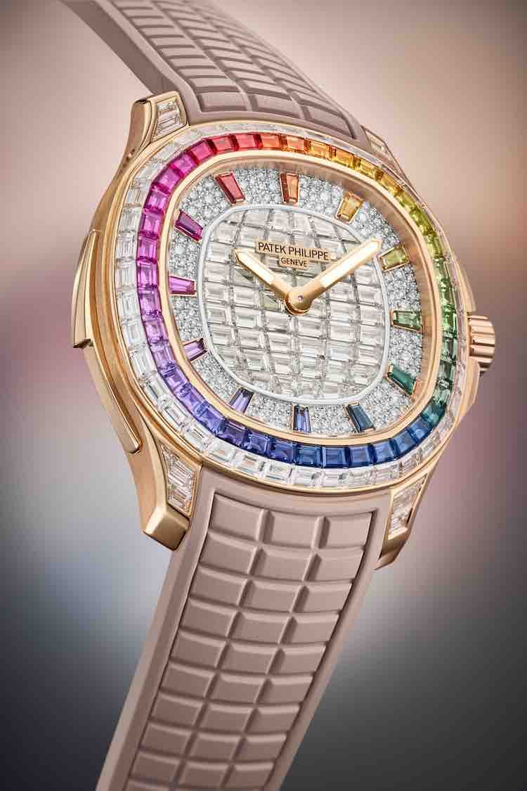 La nuova referenza 5260/355R-001 in oro rosa esibisce 52 zaffiri multicolori taglio baguette, 112 diamanti taglio baguette e 160 diamanti taglio brillante. La forma originale della lunetta ottagonale Aquanaut è sottolineata dalla doppia fila di pietre preziose inserite grazie alla tecnica dell’incastonatura invisibile. Al centro del quadrante spicca il pavé di diamanti che richiama il caratteristico motivo Aquanaut Luce, con dodici zaffiri multicolore che garantiscono una leggibilità ottimale sugli indici. Il segnatempo, dal diametro di 38,8 mm, ospita al proprio interno il Calibro R 27 a carica automatica, che suona a richiesta l’ora, i quarti e i minuti trascorsi dall’ultimo quarto su due timbri tradizionali, mediante la semplice pressione del cursore sul fianco sinistro della cassa.