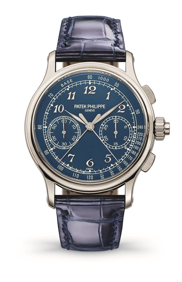 Seconda novità delle Grandi Complicazioni di Patek Philippe è il Cronografo à rattrapante Ref. 5370P dotato di un inedito quadrante blu che ravviva la tradizione degli smalti Grand Feu. Ore e minuti sono visualizzati con estrema chiarezza grazie alle lancette “a foglia” con rivestimento luminescente e alle cifre stile Breguet in oro bianco applicate. La stessa precisione e la stessa rapidità di lettura caratterizzano anche la misurazione dei tempi brevi, con le sottili lancette centrali del cronografo e rattrapante, la lancetta del contatore 30 minuti istantaneo in oro bianco e le scale stampate in bianco che si stagliano sullo sfondo blu. Tradizione e innovazione caratterizzano il movimento cronografico “due tempi”, con due pulsanti per le tre funzioni del cronografo e un pulsante integrato nella corona a ore 3 per la lancetta rattrapante. Cassa in platino lucido e cinturino in alligatore blu notte, con piccolo diamante incastonato tra le anse del bracciale a ore 6, il modello è in vendita al prezzo di 242.662 franchi svizzeri, circa 226.000 euro.