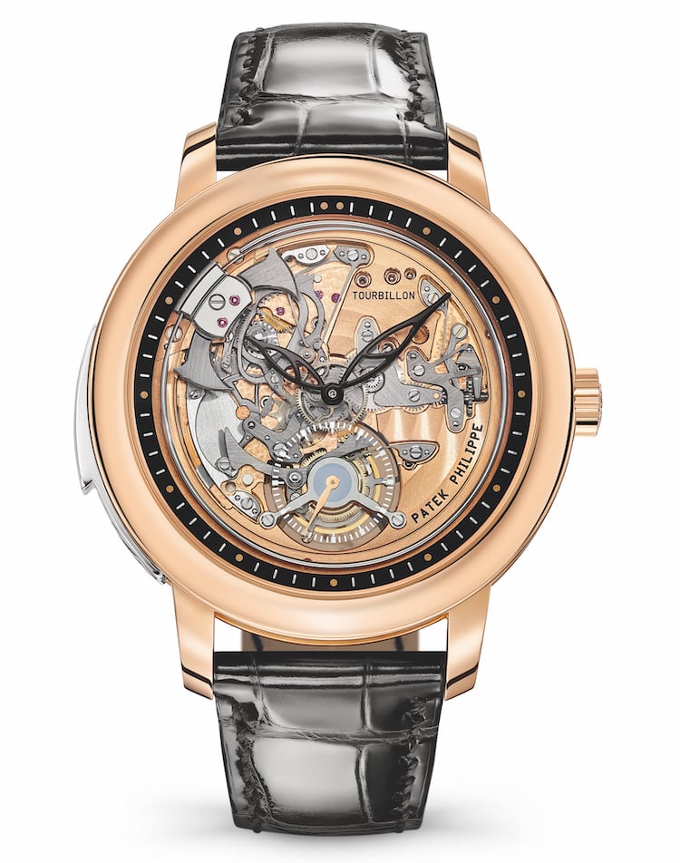 Tre novità per arricchire la già vasta offerta della collezione Grandi Complicazioni e ribadire la passione di Patek Philippe per un’alta orologeria capace di fondere tradizione e innovazione. A partire da un modello, la nuova Ref.5303, che può reclamare il titolo di prima Ripetizione Minuti della maison con meccanismo di suoneria visibile lato quadrante. Un segnatempo che si inserisce perfettamente nella lunga storia di un marchio diventato celebre in tutto il mondo agli inizi del XX secolo per le sue “supercomplicazioni” e che riprende nel design la versione presentata, in edizione limitata, al Watch Art Grand Exhibition Singapore del 2019. L’architettura aperta permette di ammirare anche al polso la Ripetizione Minuti all’opera, compresi per la prima volta timbri e martelli, con una trasparenza estesa a livello del tourbillon che lascia intravedere la parte posteriore della gabbia attraverso il contatore dei piccoli secondi a ore 6. La cassa in oro rosa si distingue invece per la lunetta larga, bombata e lucida e per gli inserti in oro bianco con decorazione “a foglia” incisa sui fianchi della carrure e delle anse del bracciale. Testato direttamente dal presidente Thierry Stern, come tutti gli orologi Ripetizione Minuti della manifattura ginevrina, il modello è in vendita per 600.000 franchi (circa 560.000 euro).