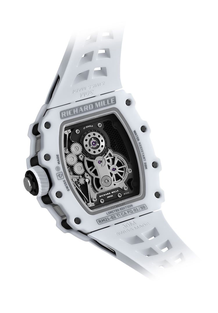 La cassa dell’RM 21-02 presenta una notevole complessità architettonica, associando perfettamente quarzo TPT e carbonio TPT con una carrure in titanio. Questa combinazione di materiali dà vita a una custodia che non è solo visivamente accattivante ma anche robusta. La cassa in tre parti è impermeabile fino a 50 metri, grazie a due guarnizioni toriche in nitrile. Per conoscere il prezzo del segnatempo Richard Mille, realizzato in edizione limitata a soli cinquanta esemplari, è necessario contattare la maison.