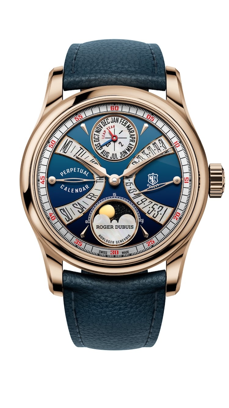 Il blu “Leman”, tono che ricorda il lago che costeggiava ogni giorno nel tragitto verso la scuola, domina la scena centrale, mentre le scale del calendario biretrogrado — la sua configurazione preferita — si aprono come archi che riportano le lancette a zero in un movimento fluido e teatrale.