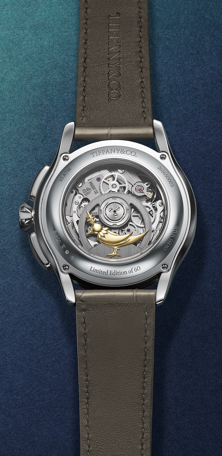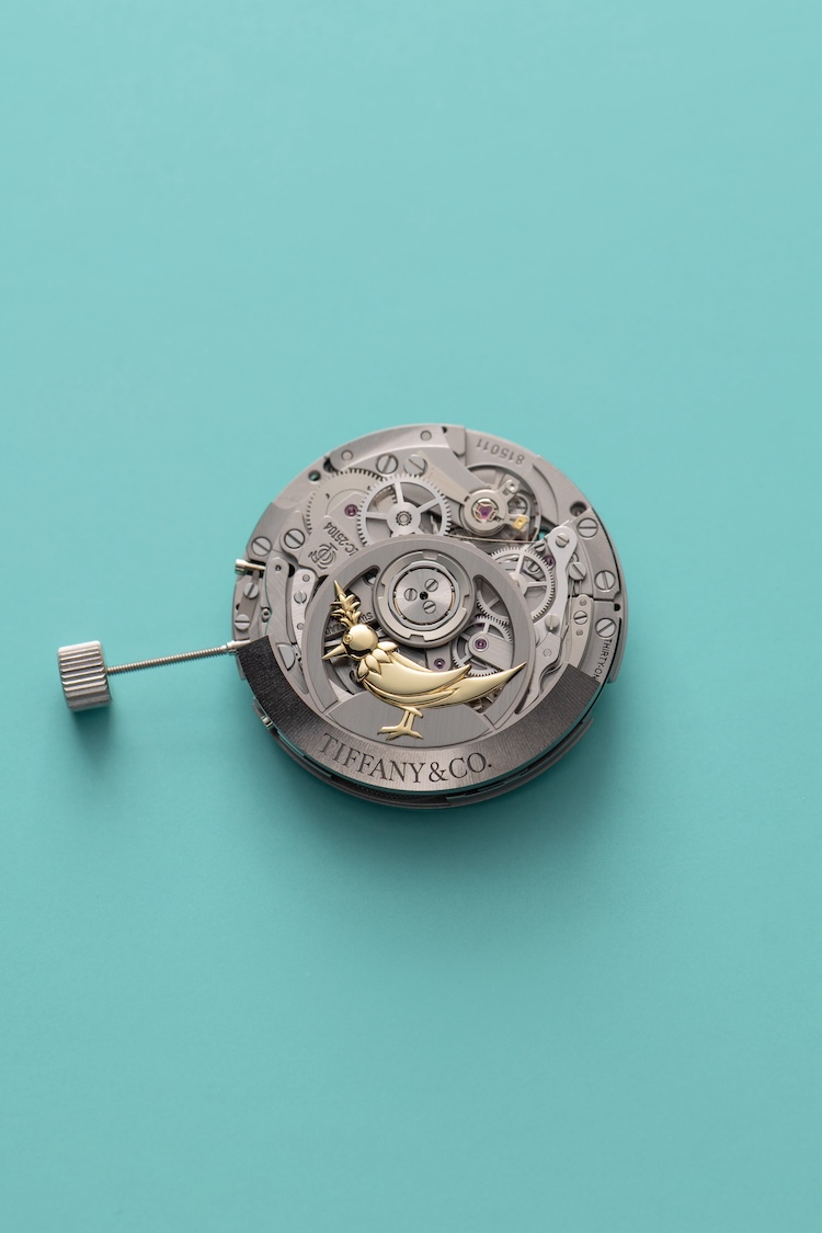 Il fondello in vetro zaffiro rivela l’elemento forse più narrativo dell’orologio: la massa oscillante decorata con il Bird on a Rock. Il celebre uccellino, simbolo della creatività Tiffany, è scolpito a mano in oro giallo 18 carati e applicato sul rotore. La sua presenza ha richiesto una ricalibrazione della massa oscillante, un intervento tecnico che sottolinea come il dettaglio decorativo sia stato integrato a livello progettuale, non aggiunto a posteriori. Il movimento offre una riserva di carica di 50 ore.