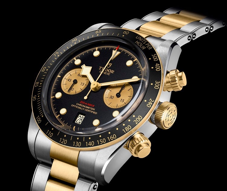 Tudor arricchisce poi con nuove varianti i modelli Black Bay 32, 36 e 41: l’ultima declinazione S&G è dotata di un bracciale a cinque maglie in oro giallo e acciaio, realizzato esclusivamente per questi orologi. Possibile la scelta tra due quadranti, ispirati ai segnatempo subacquei prodotti dalla maison negli anni ’50: nero laccato o color champagne satinato con lavorazione sunray. Degli illustri predecessori, i Black Bay riprendono anche le lancette dalla forma spigolosa, le cosiddette “Snowflake”, e la grande corona di carica. I prezzi oscillano tra i 3.750 e i 3.950 euro.Infine, Tudor presenta la versione S&G del Black Bay Chrono, il primo cronografo della maison con movimento di manifattura a carica automatica, ruota a colonne e frizione verticale. Un modello sportivo, che combina la vocazione acquatica rappresentata della serie con una funzione da sempre vicina al mondo delle piste automobilistiche. Cassa in acciaio da 41 mm, con quadrante nero con contatori concavi color champagne e datario a ore 6, il Black Bay Chrono custodisce il calibro MT5813 con riserva di 70 ore. Disponibile con cinturino nero o bracciale in acciaio e oro giallo, l’orologio ha un prezzo che oscilla tra i 5.350 e i 6.500 euro a seconda della versione scelta.