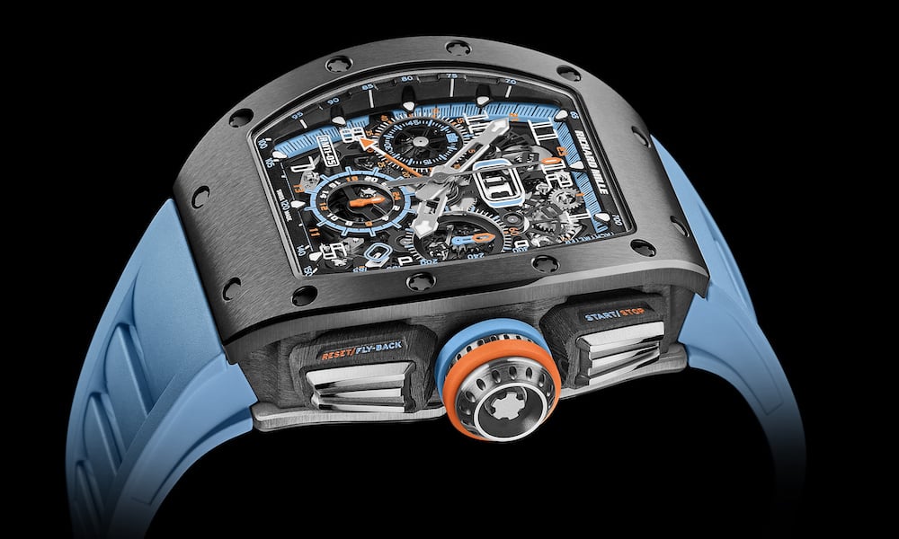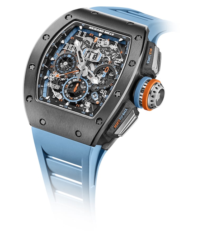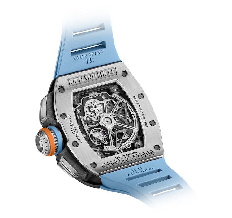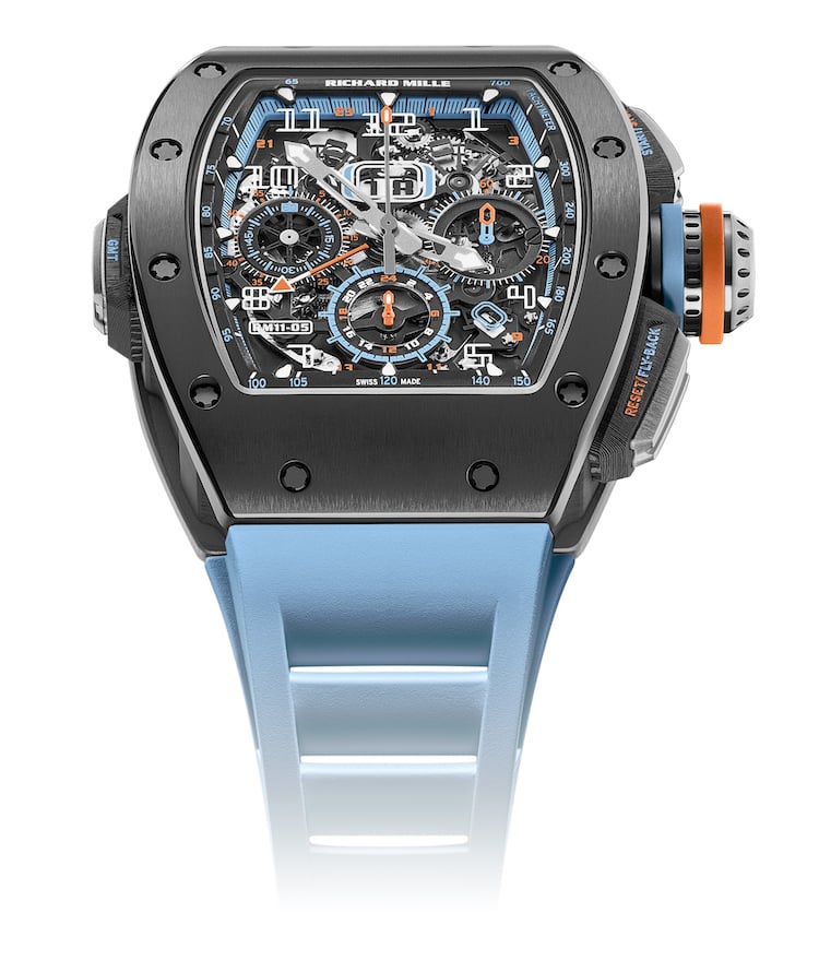 L’uso del carbonio Tpt per la parte centrale della cassa, del titanio di grado 5 sul fondello e del Cermet grigio per la lunetta contribuiscono a una significativa riduzione del peso dell’RM 11-05. All’interno dell’orologio Richard Mille è custodito un movimento automatico con funzione di Cronografo Flyback 24 ore, calendario annuale e GMT (Greenwich Mean Time) con impostazione molto semplice grazie al pulsante a ore 9. Il modello è disponibile in edizione limitata a 140 esemplari.