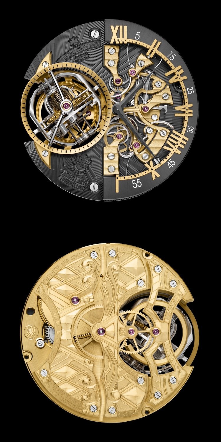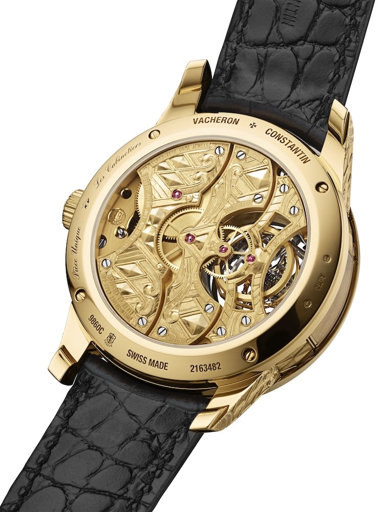L’orologio ha una cassa dal diametro di 45 mm ed è completato da cinturino in pelle di alligatore nero con fibbia déployante. All’interno, il segnatempo Les Cabinotiers tourbillon armillare – Omaggio all’Art Déco di Vacheron Constantin ospita il calibro 1900, con riserva di carica di 58 ore e ben 57 complicazioni. L’ora si legge a destra grazie all’indicazione retrograda con lancette in titanio grado 5 che si muovono su un binario semicircolare scandito da numeri romani per le ore e numeri arabi per i minuti. Racchiuso in un ampio rehaut, il binario rivela parte del movimento, accentuando il carattere tecnico del segnatempo, già sottolineato dalla struttura del regolatore. Il nome “armillare” del tourbillon è legato ad Antide Janvier, astronomo e orologiaio del re Luigi XVI che realizzò una sfera mobile con una ruota dei pianeti detta “armillare”.