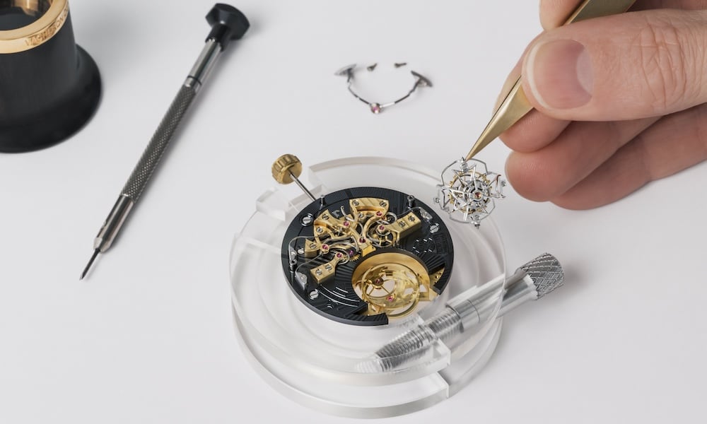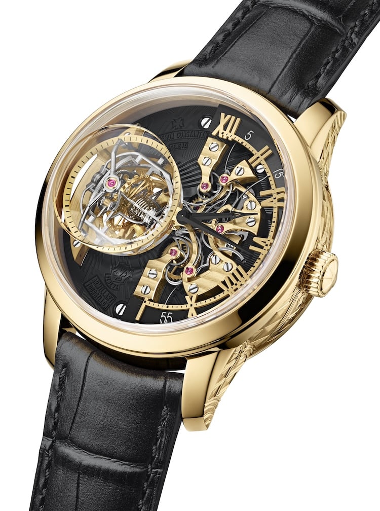 Il nuovo Les Cabinotiers tourbillon armillare – Omaggio all’Art Déco si presenta con generoso tourbillon armillare e quadrante scheletrato con display bi-retrogrado. La decorazione non prevede solo la rielaborazione dei ponti e della platina del calibro 1990, ma anche la realizzazione di un fregio sulla carrure che si estende alle anse. I maestri incisori hanno utilizzato diverse tecniche per la cassa e i ponti posteriori del movimento, a partire dal guillochage applicato alla cassa in oro giallo e dal movimento lavorato in una lega di nichel-argento scelta per la sua rigidità. Sul lato anteriore, il calibro è interamente guilloché a mano in un motivo a raggiera perfettamente geometrico. Il metallo è stato sottoposto a un trattamento superficiale DLC nero per accentuare il contrasto con il colore della cassa e dei ponti, richiamando ancora una volta l’associazione di ottone e ferro battuto tipica dell’Art Déco.