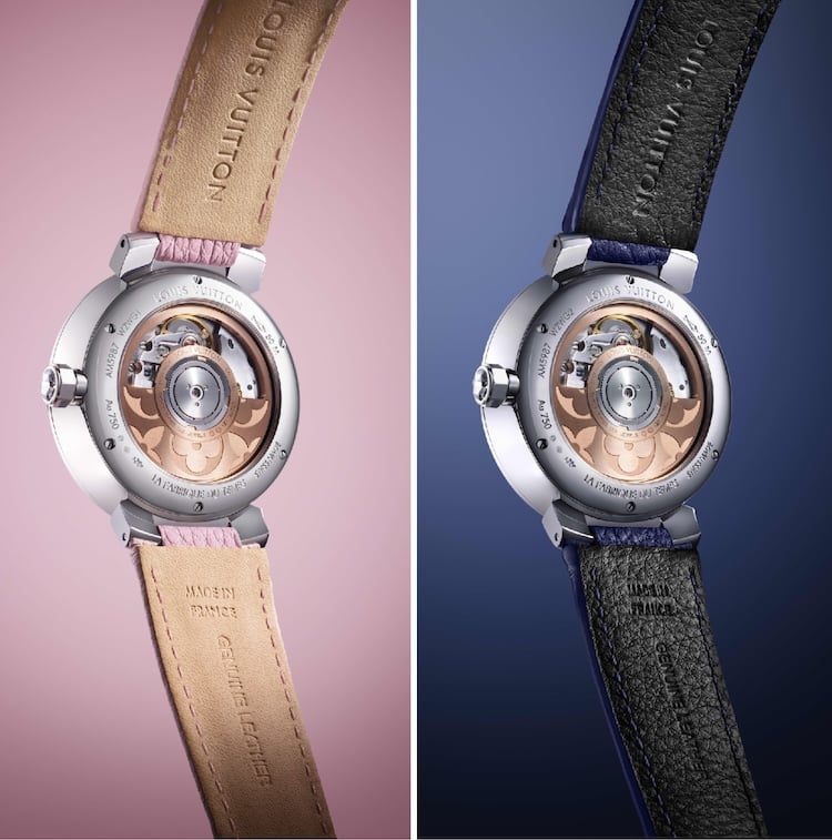 All’interno, i due orologi Louis Vuitton ospitano un innovativo movimento meccanico jumping hours che offre una modalità originale di lettura del tempo, alternandosi tra le due aperture separate posizionate sui quadranti. Per ammirare a pieno il movimento LV 180, con massa oscillante in rosa rosa incisa con fiori Monogram, la maison ha dotato i segnatempo di un fondello in vetro zaffiro.