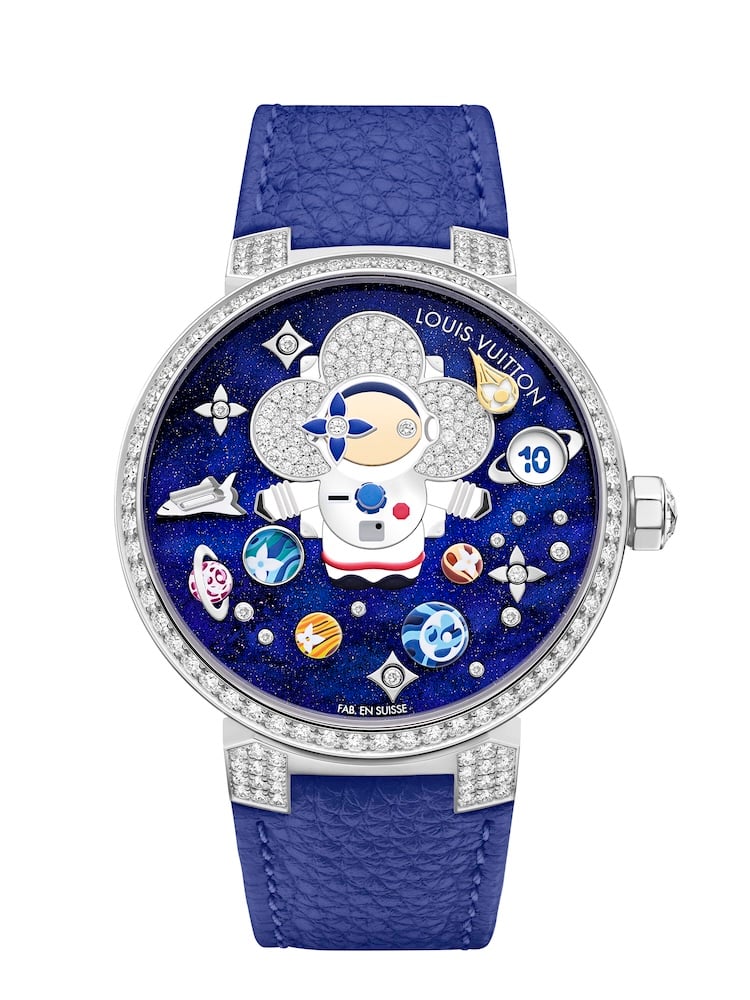 Per il modello Tambour Slim Vivienne Jumping Hours Astronaut, la maison ha invece ideato un quadrante che combina la madreperla blu con un’avventurina dello stesso colore. Vivienne si trasforma in questo caso in esploratrice tra le stelle, immersa in una costellazione di diamanti a forma di fiori, razzi e pianeti.