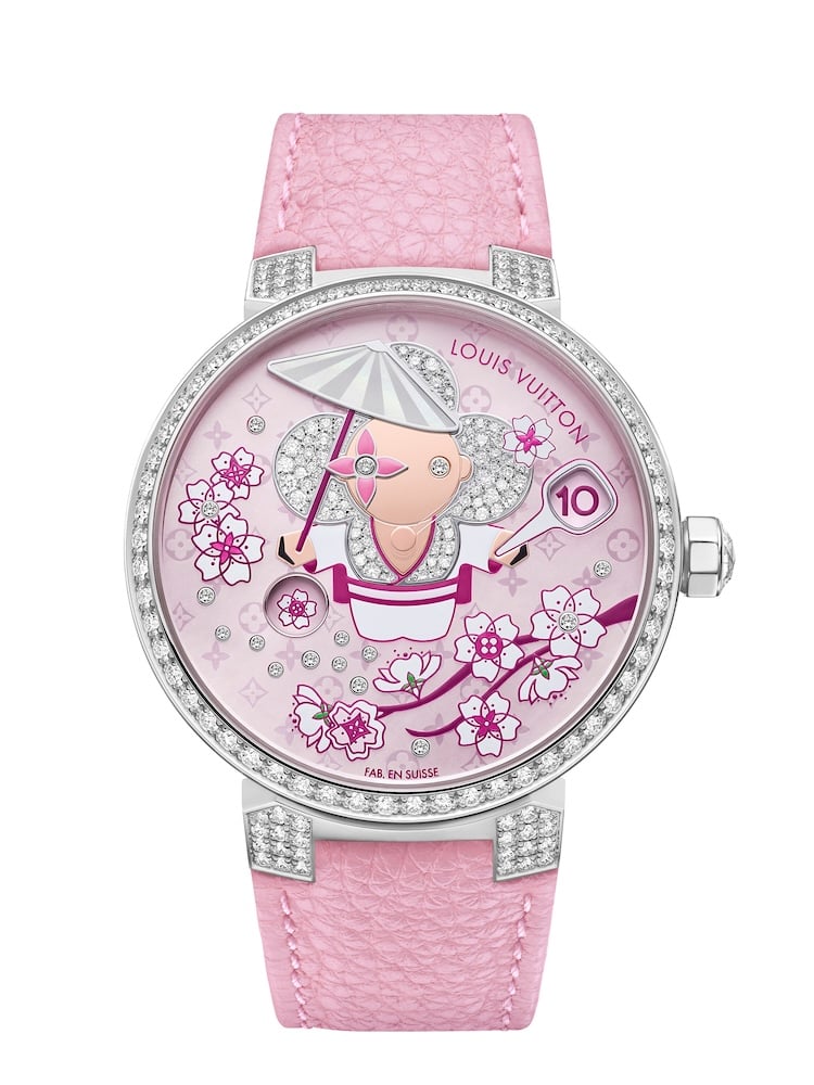 Il gioco di luci si intensifica grazie ai diamanti incastonati sul volto di Vivienne, ai fiori e ai rami di ciliegio in miniatura, dipinti a mano dagli artigiani de La Fabrique du Temps Louis Vuitton. Con indosso un kimono e in mano un ombrello a ventaglio, la mascotte del brand indica l’orario alternando due aperture che possono mostrare sia un fiore sia l’ora. I minuti sono segnalati da una lancetta trasparente con un fiore di ciliegio all’estremità, che sembra oscillare attorno al quadrante.