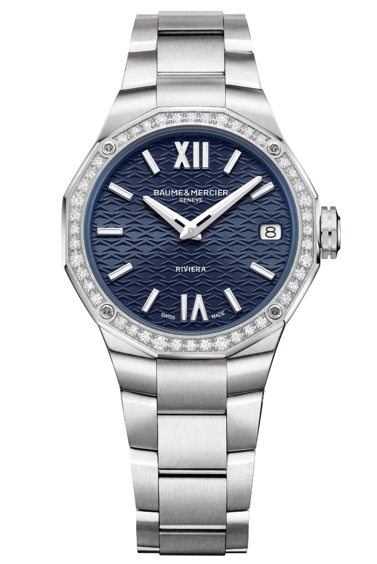 Declinazione di lusso dello sportivo chic di Baume & Mercier, il Riviera Diamantiha una cassa da 33 mm di diametro e 9,5 mm di spessore e lunetta in acciaio con finitura soleil impreziosita da 44 diamanti taglio brillante (Top Wesselton, qualità VS, 0,47 carati) e fissata con quattro viti in acciaio lucido. Il fondello pieno dodecagonale può essere inciso. Il movimento è al quarzo ma offre ben 10 anni di autonomia.
