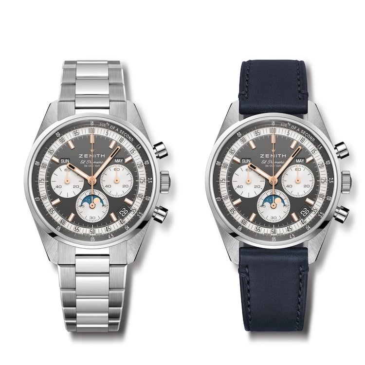 Due le versioni distinte del quadrante: uno più sportivo bianco-argentato “panda” con contatori neri e scala 1/100 di secondo e l’altro in grigio con motivo ardesia “sunburst”, con contatori bianco-argenté ispirati ai primi prototipi con triplo calendario del Primero degl 1970.