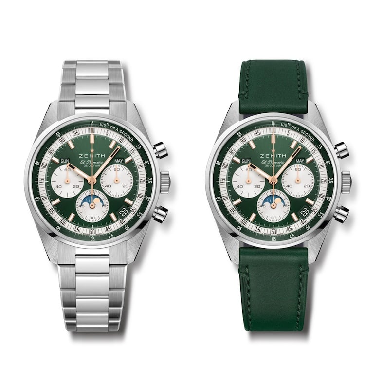 Una terza variante di quadrante solo presso le boutique Zenith ed è realizzata in una tonalità verde oliva, con indici e lancette dorati applicati.