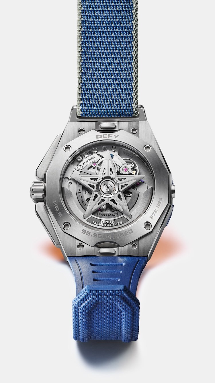 Visibile attraverso il fondello in vetro zaffiro, il calibro automatico di manifattura Zenith ad alta frequenza El Primero 3620-SC. Un meccanismo che offre 60 ore di autonomia e uno scappamento antimagnetico con componenti essenziali in silicio non metallico.