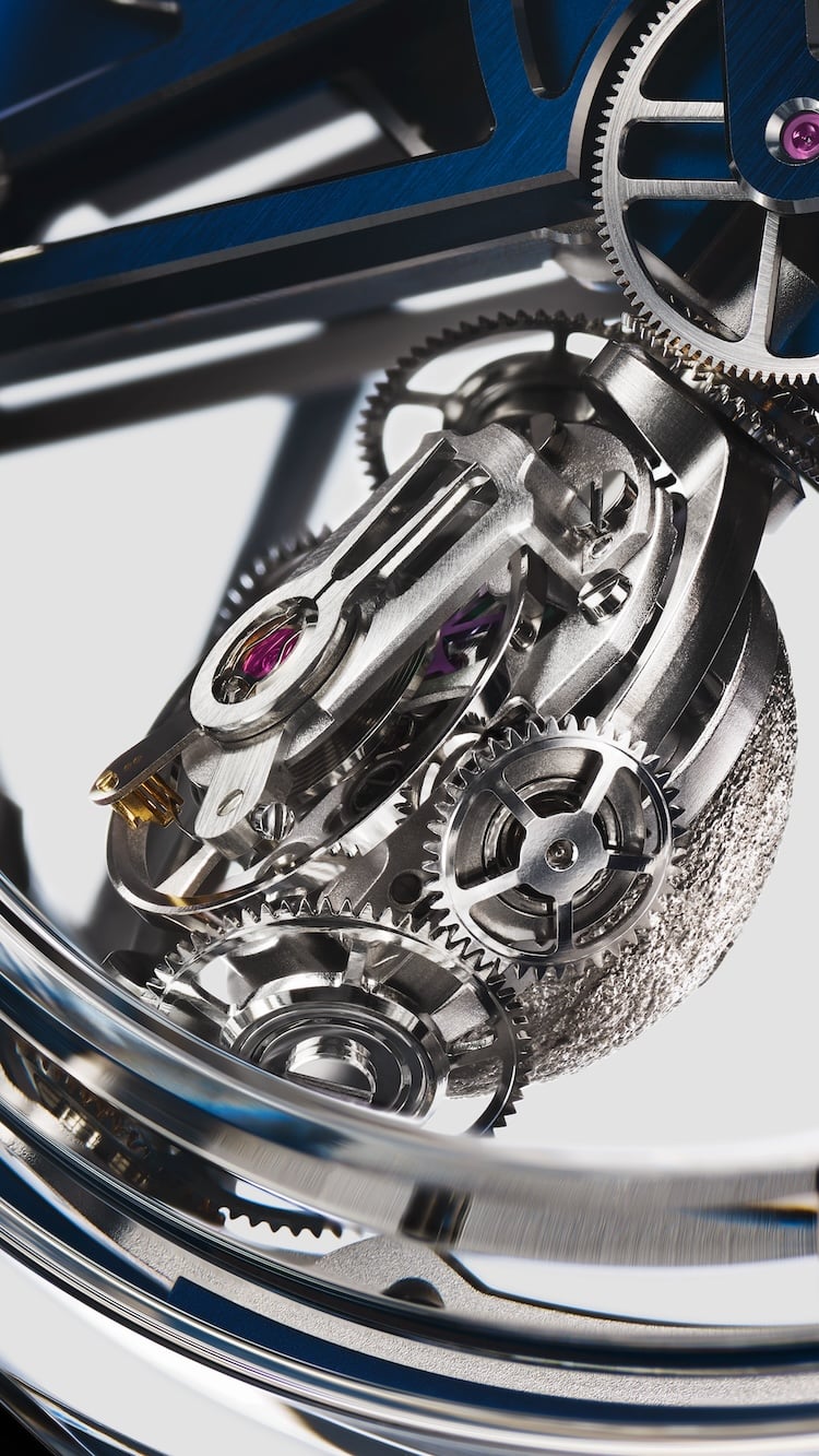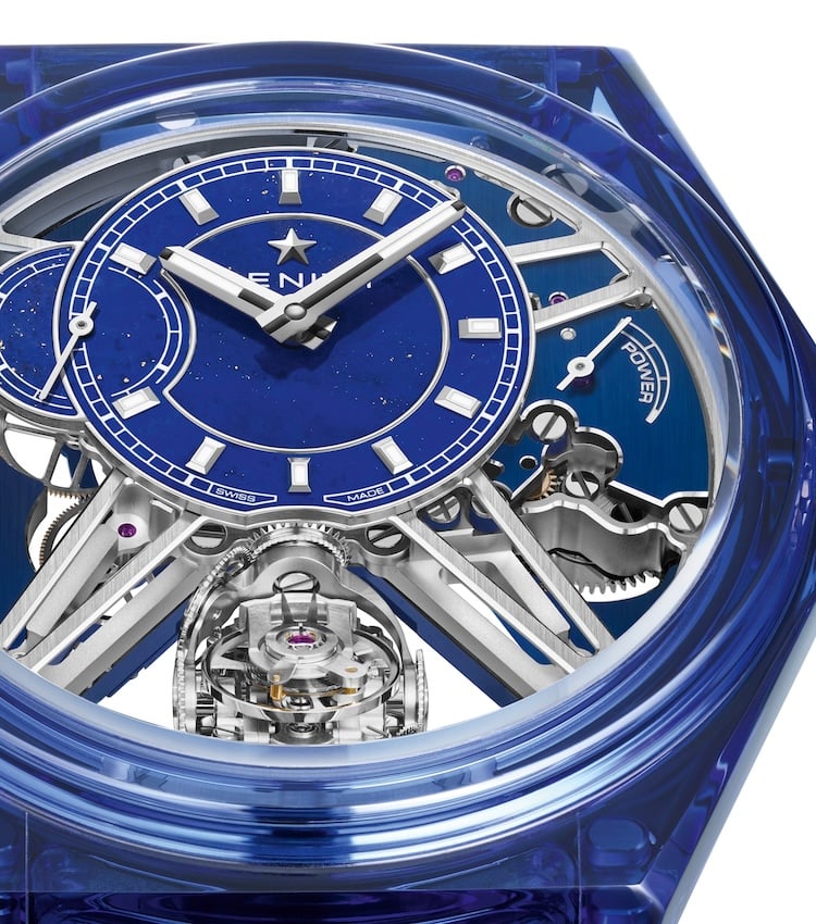 Due versioni — una in zaffiro blu e una completamente trasparente — mettono a nudo l’architettura del calibro El Primero 8812S, esibendo la miniaturizzazione estrema del suo modulo “Gravity Control”.