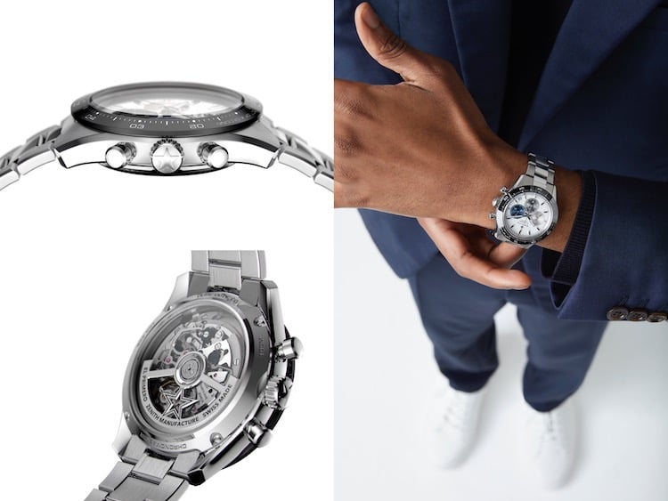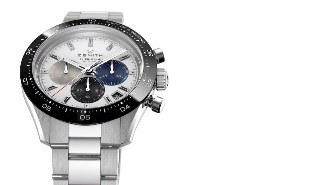 Il calibro El Primero 3600 è frutto di un’esperienza maturata in cinquant’anni con la produzione dell’iconico movimento, grazie alla quale Zenith è in grado di offrire oggi un’indicazione dell’ora con una precisione di lettura al 1/10 di secondo tramite lo scappamento da 5 Hz (36.000 A/ora), nonché una riserva di carica estesa a 60 ore. Visibile attraverso il fondello in vetro zaffiro, la nuova struttura rivela una ruota a colonna di colore blu e un rotore aperto caratterizzato dalla stella a cinque punte della maison. Il prezzo della versione con bracciale in acciaio è di 9.700, mentre per quella con cinturino in caucciù di 9.200 euro.